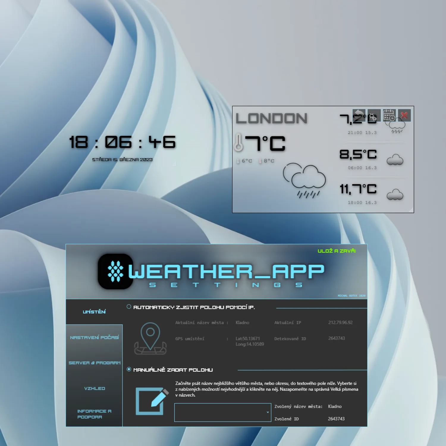 Program napsaný pro soutěž na serveru ITNetworks.cz. Jednoduchý prográmek pro zobrazení aktuálního počasí a jeho předpovědi v několika designových variantách využitím OOP C# NET pro operační systém Windows, který v té době takovou lištu neměl. Vlastní design ikon a veškeré grafiky programu.